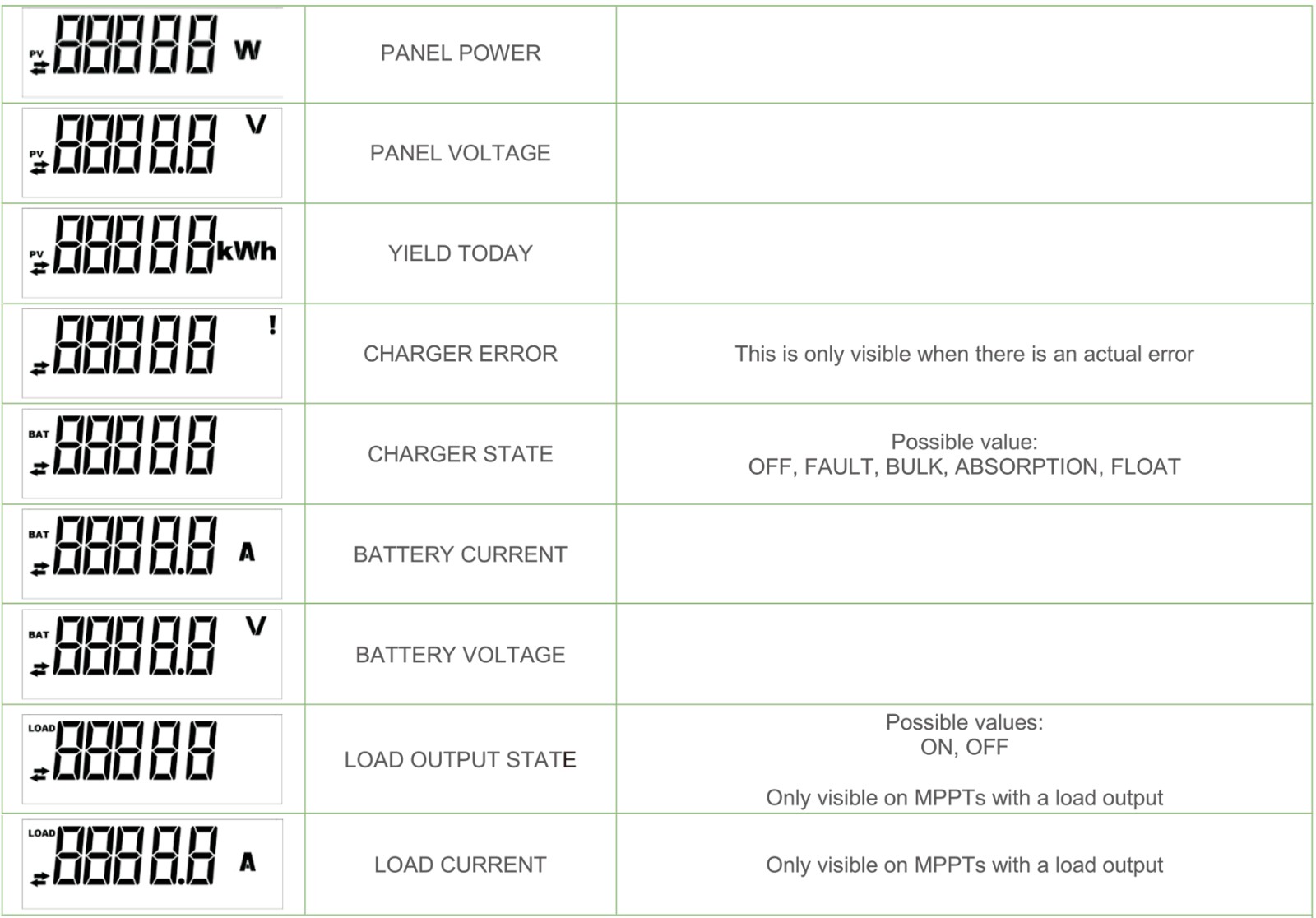 When viewing values, one can select a different day by pressing the up and down button.' The MPPT Control will first show the value for a short time, then the currently selected day, and then the value again. When viewing an overall history value, pressing the up or down button will cause the MPPT Control to show“TOTAL".