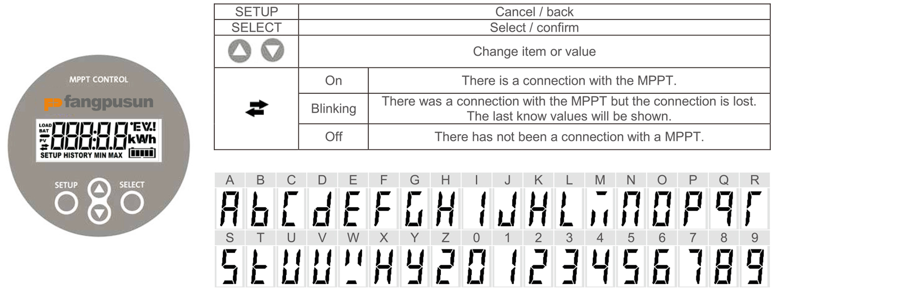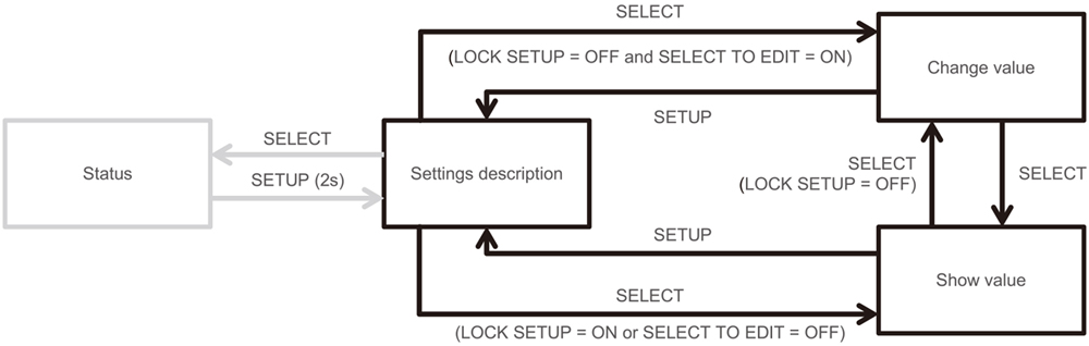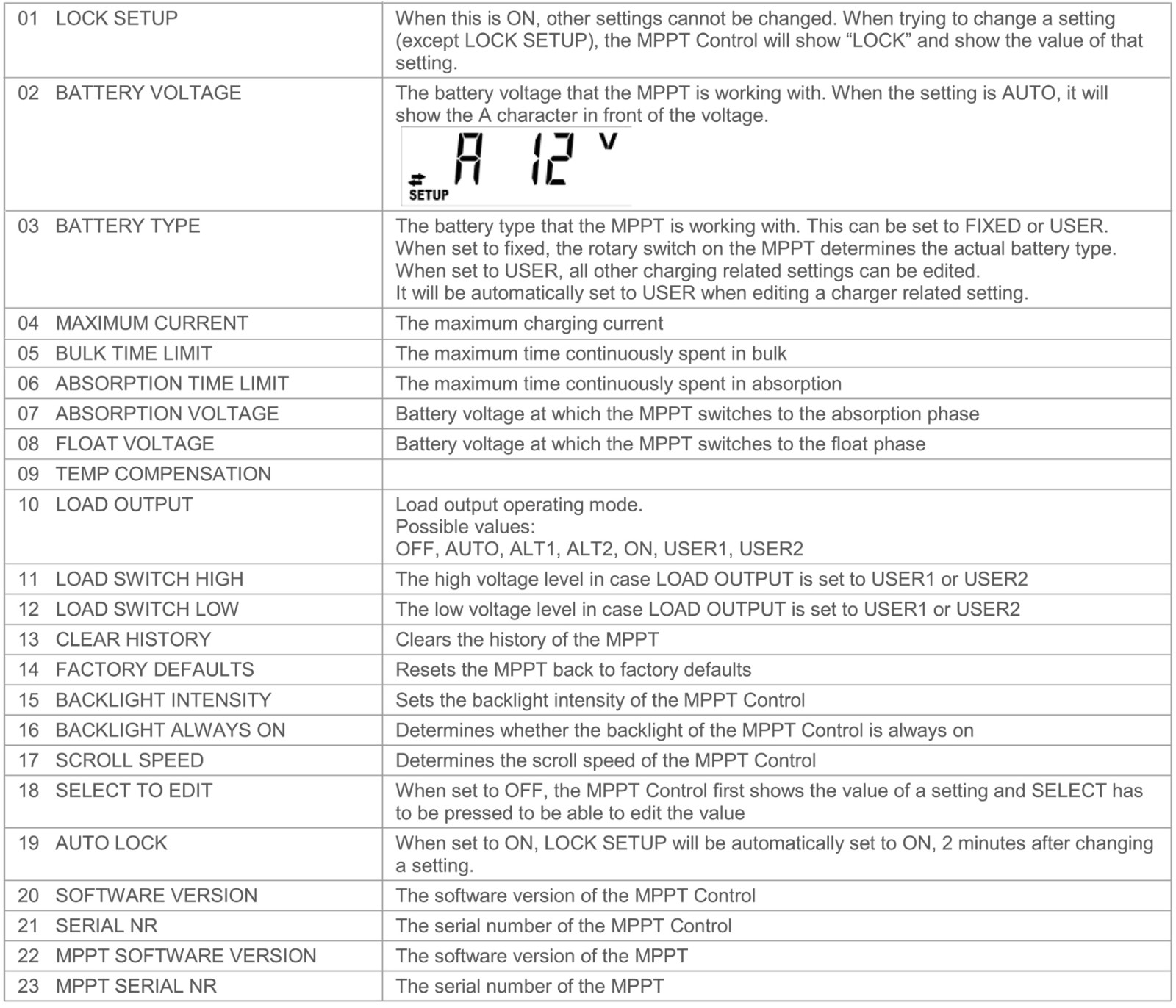 By pressing SETUP for 2 seconds in the status menu, the settings menu is entered. Here, the settings of the MPPT and MPPT Control can be viewed and changed. First the topic is shown and when SELECT is pressed, the corresponding value is shown. When SELECT TO EDIT is OFF, the value is shown before it can be changed by pressing SELECT again. When SELECT TO EDIT is ON, the current value is shown and a new value can immediately be selected. When LOCK SETUP is ON, settings only be changed after setting LOCKSETUP to off.
