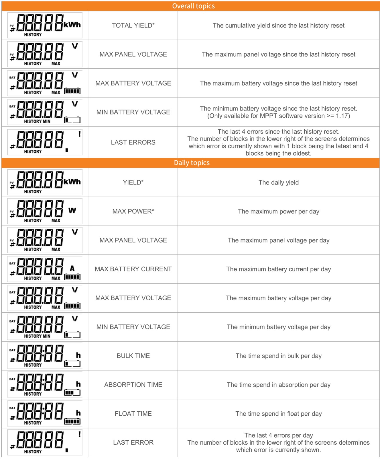 contains both overall history and well as a day to day history. For MPPTs with software version up to 1.15, only a few history topics are available and the day to day history contains 2 days: the current day and the previous day. For MPPTs with software version 1.16 and onwards, this is a 30 day history.